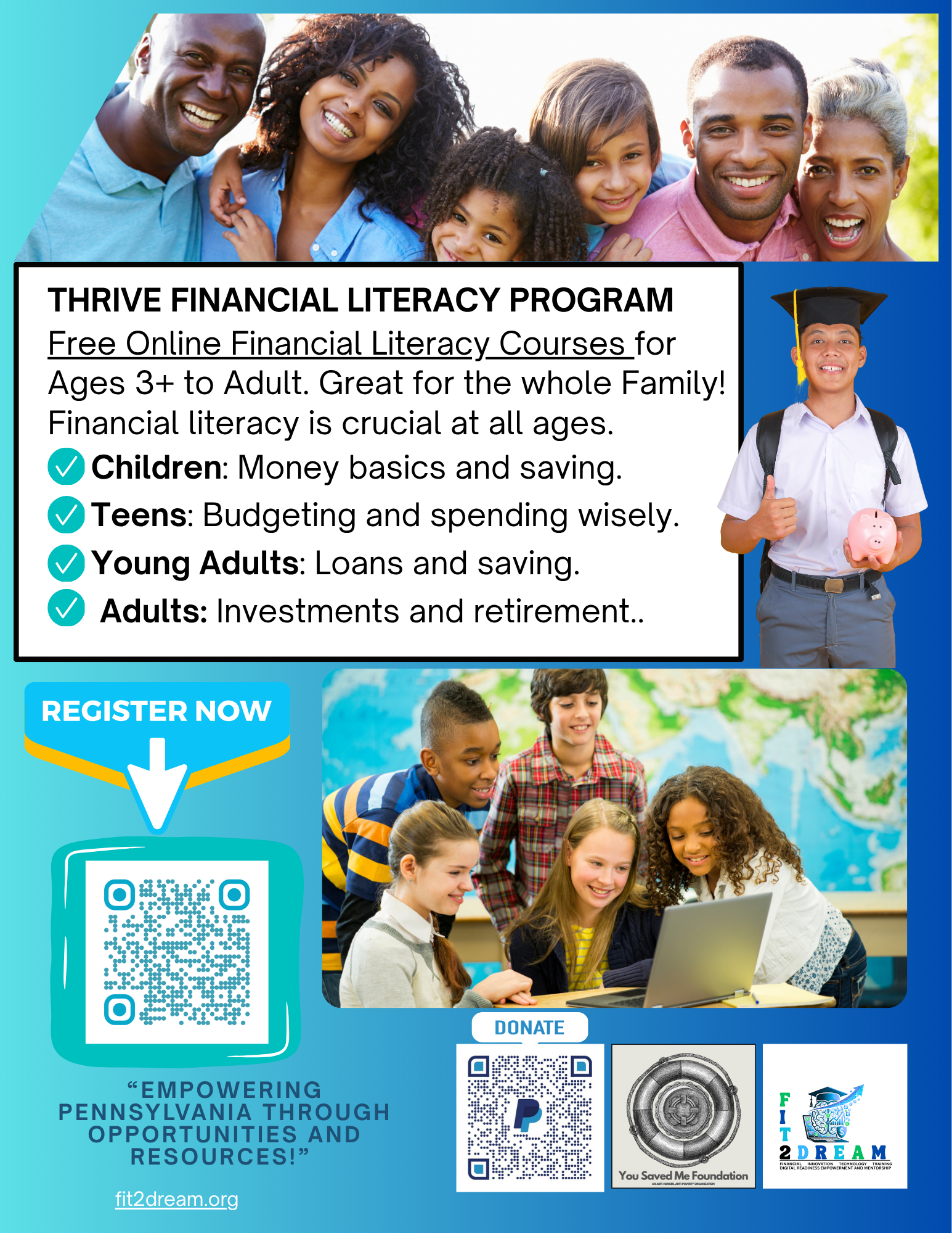 THRIVE is a 6-month program empowering disadvantaged youth (ages 3–24) with financial literacy and digital career skills for a prosperous future.